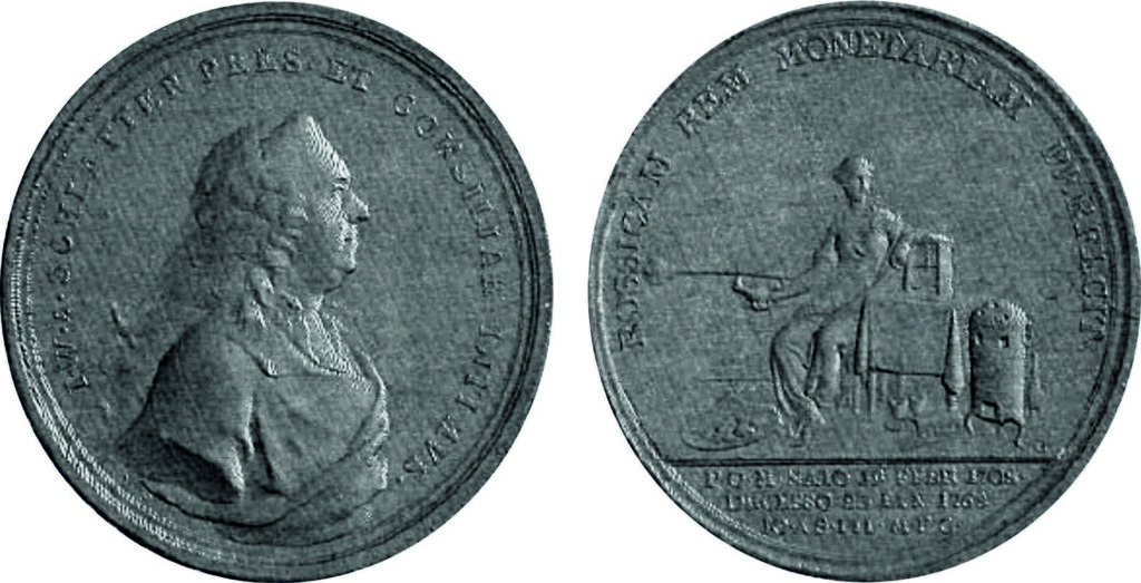 Реверс: ARS AMICVM LVGET PAVPER PRAESIDIVM (Искусство дружбы — на благо правительства). Под обрезом. DEN. D. III IVL MDCCLXXXIV (Скончался 3 июля 1784).