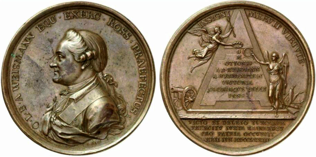 Аверс: O • L • В • A • WEISMANN EQU • EXERC • ROSS • PRAEFECTUS • (Барон Отто Вейсман, генерал российских войск и кавалер). Бюст барона О. Вейсмана влево, в парике, с орденом на груди, внизу подпись I • В • GASS • F • (И.Б. Расс исполнил)