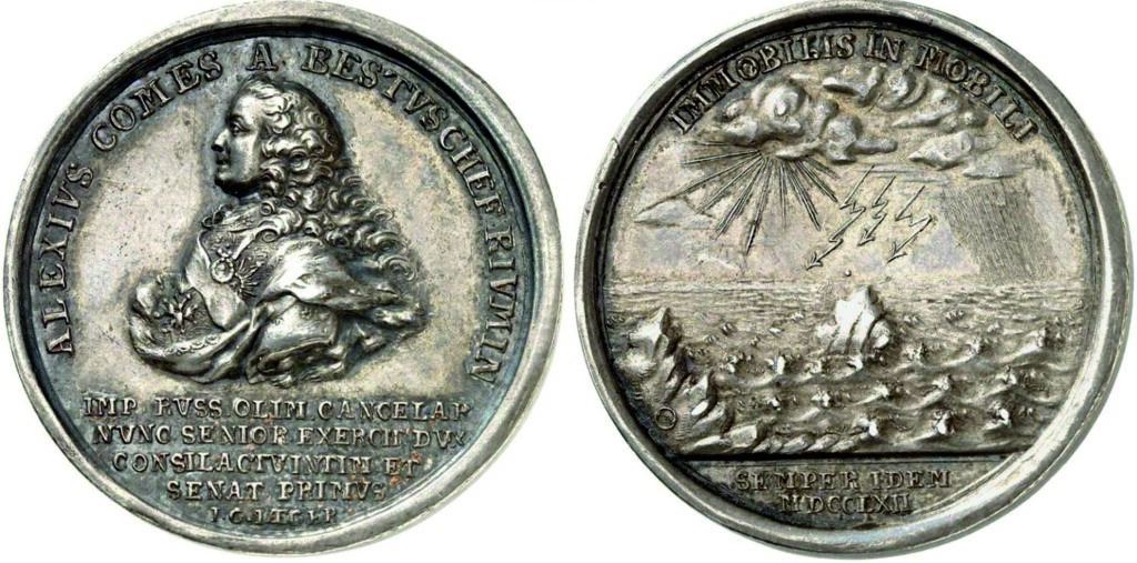 Аверс: ALEXIVS COMES A BESTVSCHEF RIVMIN (Алексей, граф Бестужев-Рюмин). Погрудный портрет А. Бестужева-Рюмина, обращенного влево, в парике, покрытого мантией и звездой ордена Св. Андрея Первозванного на груди. Под портретом четырехстрочная надпись: IMP • RVSS • ОLIМ • CANCELAR • | NVNC • SENIOR • EXERCIT • DVX • | CONSIL • АСТV • INTIM • ЕТ | SENАТ • PRIMVS • (Прежде российский государст венный канцлер ныне фельдмаршал, действительный тайный советник и первый сенатор). Внизу инициалы I • G •W • F • (И.Г. Вехтер* исполнил)