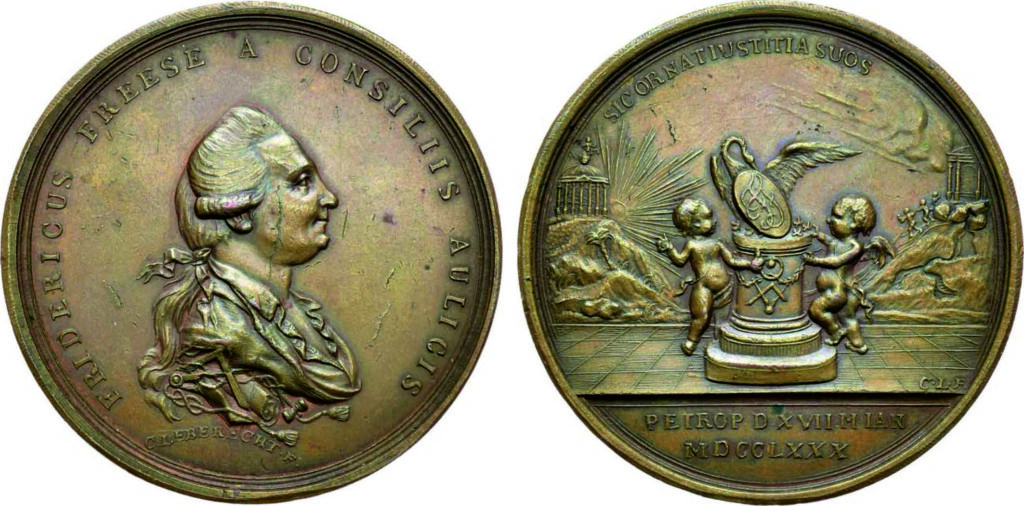 Аверс: FRIDERICUS FREESE A CONSILIIS AULICIS (Фридрих Фрезе, надворный советник). Бюст Ф. Фреезе вправо, в парике, внизу подпись С • LEBERECHT • F • (К. Леберехт исполнил)