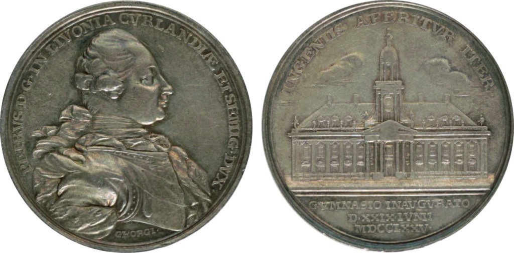 Реверс: Вверху по кругу: «INGENIIS APERITVR ITER•» (Гению вход открывает); внизу под обрезом: «GVMNASIO INAVGVRATO / D•XXIX•IVNII / MDCCLXXV•» (Гимназия открыта 24 июня 1775 года).