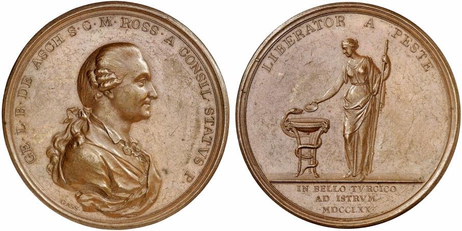 Аверс: GE • L • В • DE ASCH S • C • M • ROSS • A CONSIL • STATVS P • (Барон Георг Аш, ее императорского величества, российский действительный статский советник). Бюст Г. Аш вправо, в парике, внизу подпись GASS