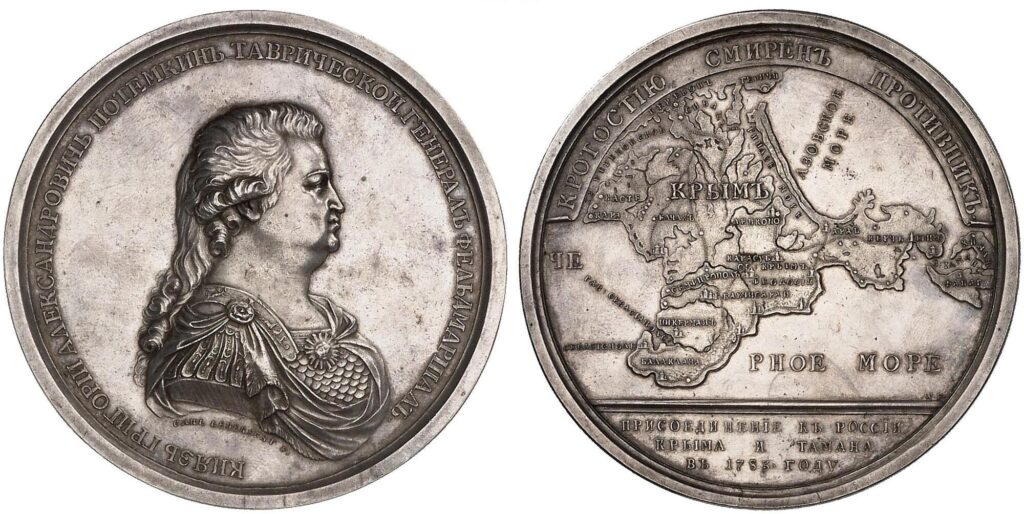 Реверс: КРОТОСТÏЮ СМИРЕНЪ ПРОТИВНИКЪ . Географическая карта Крыма и Таманского залива. Справа над обрезом инициалы W • F • (Вехтер исполнил)