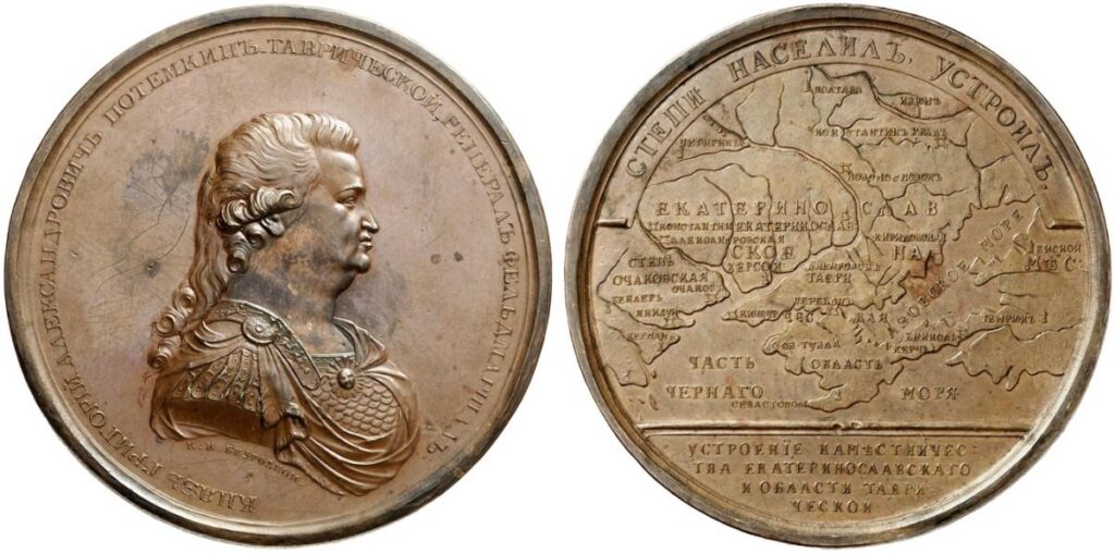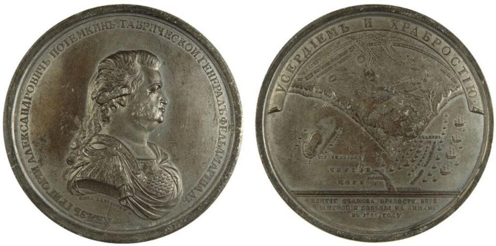 Аверс: КНЯЗЬ ГРИГОРIЙ АЛЕКСАНДРОВИЧЬ ПОТЕМКИНЪ ТАВРИЧЕСКОЙ ГЕНЕРАЛЪ ФЕЛЬДМАРШАЛЪ • Бюст князя Г.А. Потемкина вправо, в парике, и в мантии поверх чешуйчатых лат. Под обрезом руки подпись CARL LEBERECHT F • (Карл Леберехт* исполнил)