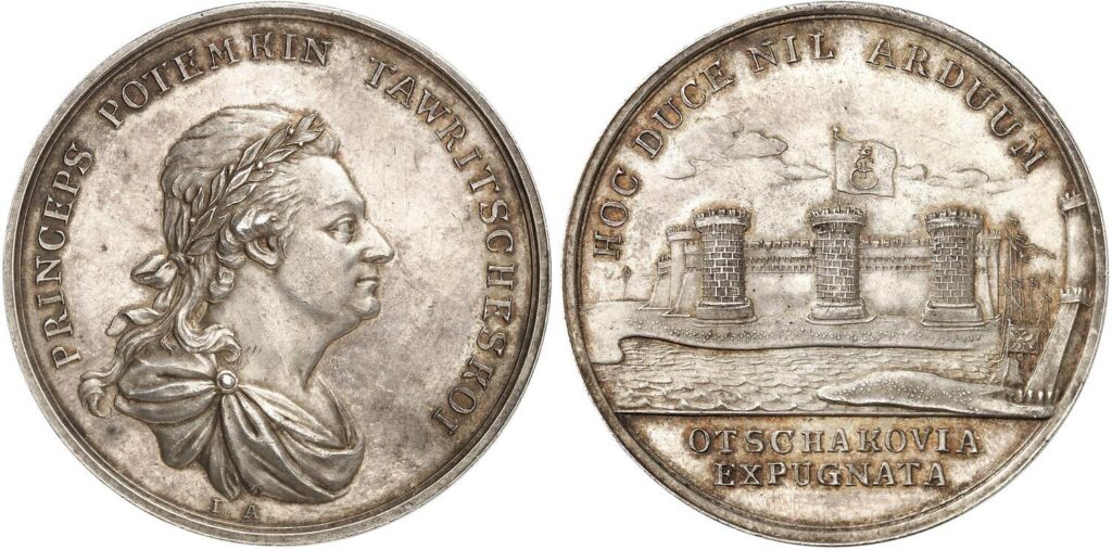 Реверс: HOC DUCE NIL ARDUUM (Сему вождю ничто не трудно). Вид крепости Очакова, на одной из башен развевается флаг с вензелем Екатерины II
