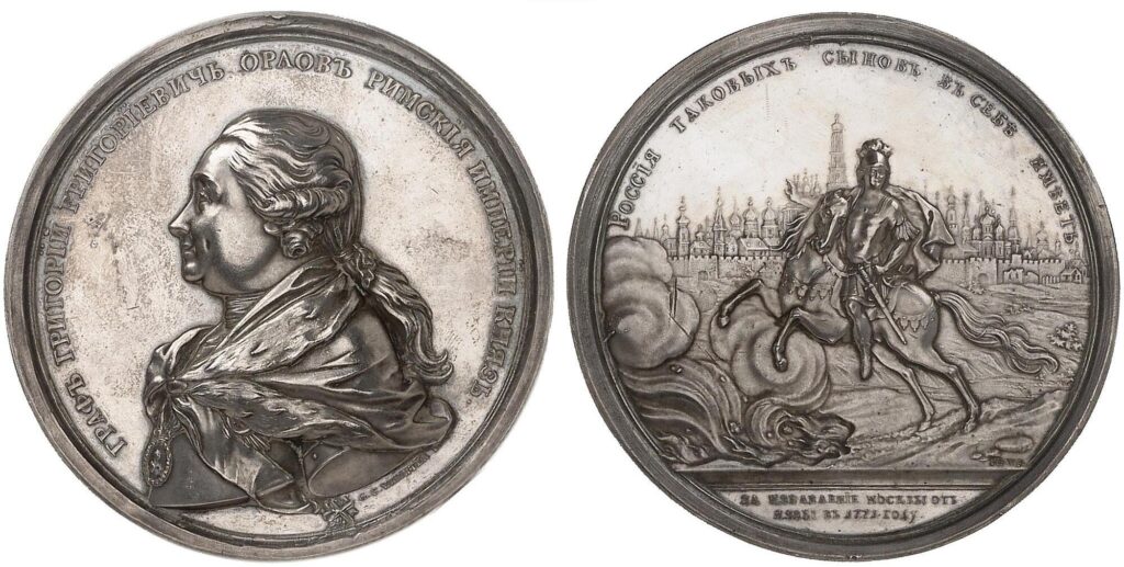 Аверс: ГРАФЪ ГРИГОРÏЙ ГРИГОРÏЕВИЧЪ ОРЛОВЪ РИМСКÏЯ ИМПЕРÏИ КНЯЗЬ • Бюст Г. Г. Орлова влево, в парике и мантии, с орденом на груди. Под обрезом рукава подпись G • С • WÆCHTER • F • (Г.Х. Вехтер* исполнил)