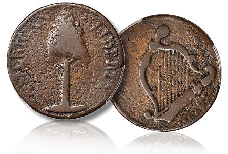 8 июня 1776 года Палата представителей постановила принимать в казначейство, в обмен на банкноты Нью-Гэмпшира, «любое количество медной монеты, отчеканенной в этой колонии, весом по пять пенни и десять зерен каждая, на сумму, не превышающую 1000 фунтов законных денег… [Эти] медные монеты должны иметь следующий тип: сосна с надписью “American Liberty” на одной стороне и арфа с датой 1776 на другой стороне». Хотя это предложение и вызвало волну энтузиазма, все же оно не было реализовано. Теоретически, однако, некоторое количество монет раннего выпуска было изготовлено для распределения среди членов законодательного собрания. В этот период правительство заседало в г. Эксетере. В том же году, но несколько позднее, Массачусетс также рассматривал возможность медной чеканки, однако и там дело не дошло до массового выпуска.